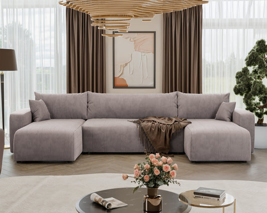 NONIPIA U-formas stūra dīvāns ar gulēšanas funkciju, ar konteineri, universāls, bēšs velvets